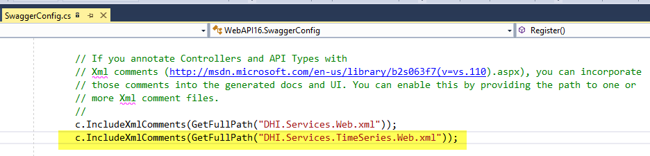 However, if you use one of the generic templates, where you add additional Web APIs to the project, you have to manually configure Swagger to use the XML-annotations of these added Web APIs. This is done in the SwaggerConfig.cs file found in the App_Start folder. In the below example, the XML-annotations of the Time Series Web API are incorporated in the Swagger documentation.